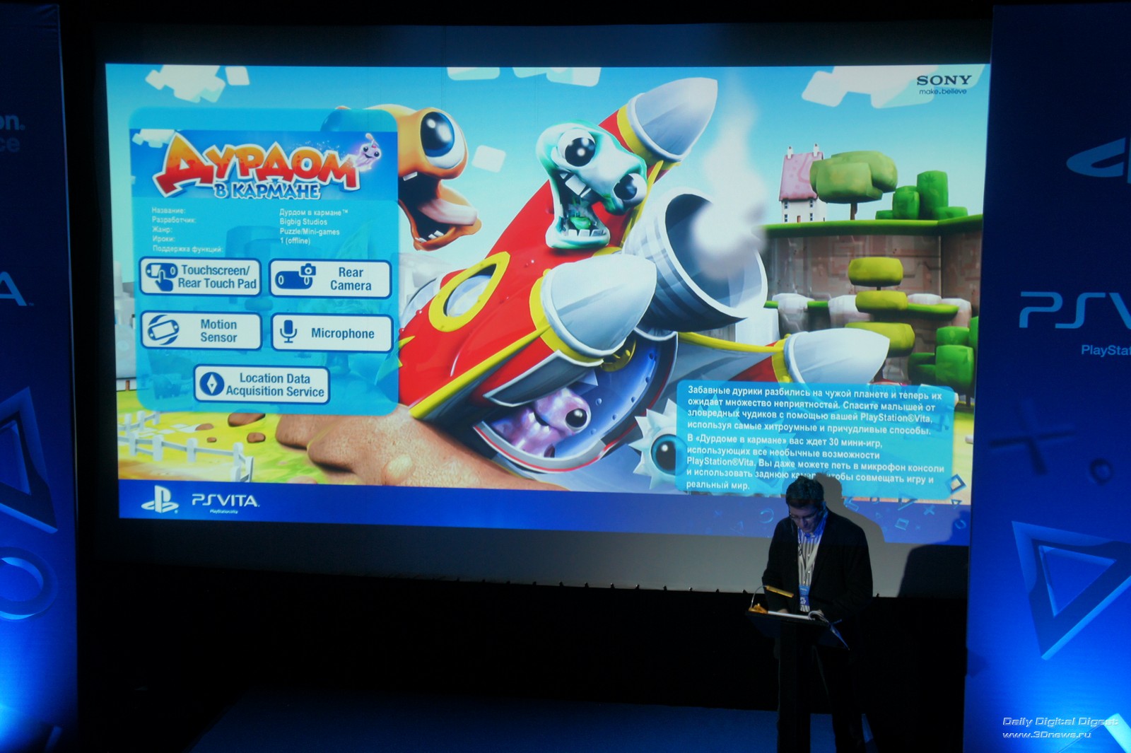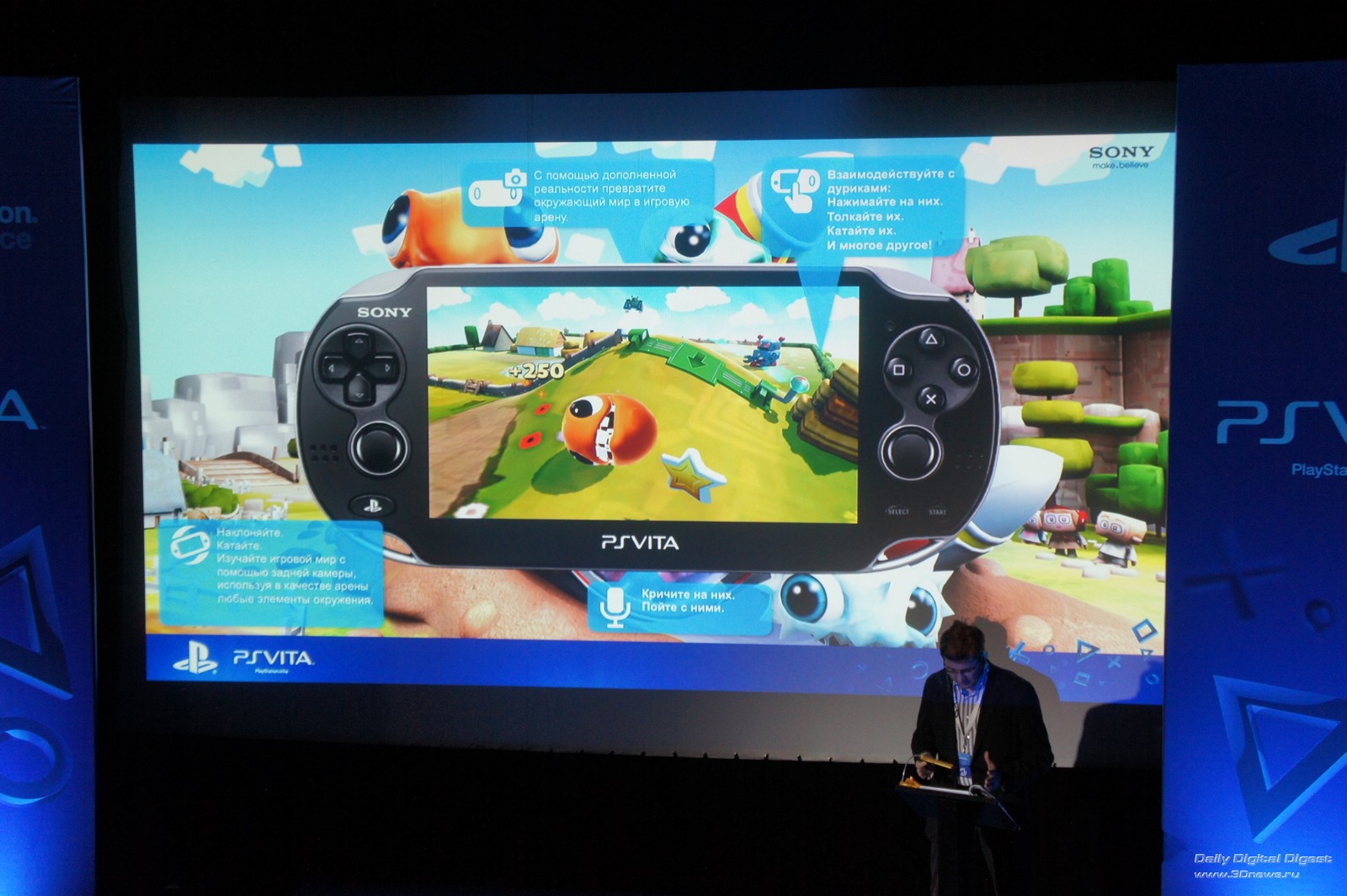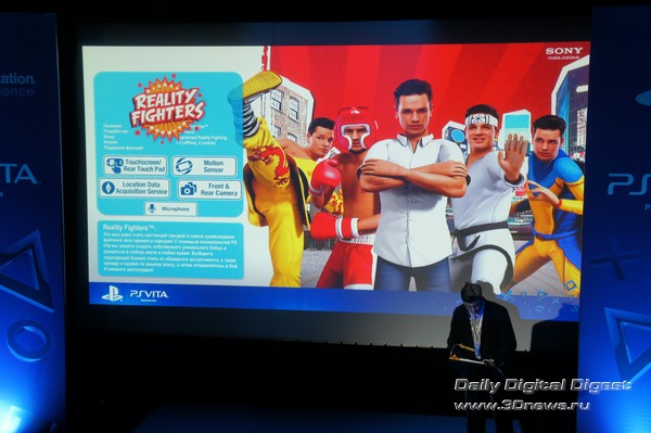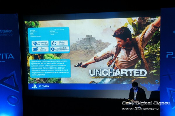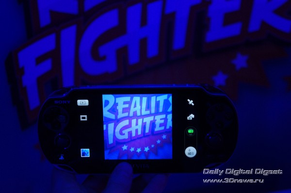 Однако во что поиграть все же есть. Что приятно, абсолютно все стартовые тайтлы заточены под применение тех или иных характерных особенностей PS Vita. Скажем, файтинг Reality Fighters поддерживает сенсорный экран, датчик движения, фронтальную и заднюю камеры, GPS и даже микрофон — последний нужен для записи «боевого клича», что бы это ни значило. Собственно, как эти органы используются, хорошо видно на весьма толковом слайде из презентации. Похоже, что в описаниях игр это будет иллюстрироваться схожим образом, так что выбирать игры и постигать тонкости управления будет легко и удобно. Кликните на изображение для увеличения Кликните на изображение для увеличения Да, стоит сразу оговориться, что вживую картинка в играх выглядит значительно лучше, чем на скриншотах. Во-первых, спасибо OLED-дисплею. Во-вторых, на 5-дюймовом экране с весьма мелким зерном многие недостатки скрадываются. В-третьих, окончательно скрыть недостаточную (по скриншотам это все-таки видно) четкость текстур и угловатость объектов помогает движение. В целом графика действительно хороша — просто для того, чтобы оценить ее по достоинству, надо самому поиграть в игры на приставке. А вот в использовании камеры для создания игрового контента — собственной карты, аватара и так далее — как оказалось, прячется здоровенный подводный валун. Дело в том, что камеры в Sony PS Vita не очень качественные, так что создаваемые с их помощью объекты и сцены неприятно контрастируют с оригинальными красотами игр. Тем более что дисплей повышенно цветастый — так что блеклые синюшные фотки кажутся еще более блеклыми и синюшными. Кликните на изображение для увеличенияКамера делает мир PS Vita более разнообразным, но бледным и окрашенным в мрачные цвета. Нужен более качественный сенсор — или хотя бы хорошая постобработка Однако перейдем к следующей игре. Это «Uncharted: Золотая бездна» (или Golden Abyss, если вам так привычнее). Здесь набор используемых элементов немного беднее — сенсорный экран, задняя камера, датчик движения и GPS. Зато графика — лучше, чем в Reality Fighters. И экшен, экшен — которого на других мобильных платформах вы просто не дождетесь: там такого рода игры выглядят как унылые перебежки от одного тира к другому. Кликните на изображение для увеличения Кликните на изображение для увеличения Кликните на изображение для увеличения Кликните на изображение для увеличения Еще одна игра: футуристические гонки Wipeout 2048. Главная фишка этого тайтла — поддержка функции Cross-Play (возможности совместной игры для пользователей PS Vita и PlayStation 3). К сожалению, ознакомиться с данной частью функционала консоли на мероприятии возможности не было, но мы обязательно вернемся к этому вопросу в полном обзоре PS Vita. Кликните на изображение для увеличения Кликните на изображение для увеличения Кликните на изображение для увеличения Напоследок еще об одной игре — «Дурдом в кармане». Первое, о чем хочется упомянуть в связи с этой игрой, — это особая гордость Sony за полную и качественную локализацию стартовых тайтлов для PS Vita. В данном случае перевели даже название. Второе: эта игра обладает поддержкой сенсорной панели, расположенной на задней стороне консоли. Прикосновения к тачпаду создают на карте холмики, заставляющие героя-колобка (называются эти колобки, извините, «дурики») двигаться по карте. Кликните на изображение для уве